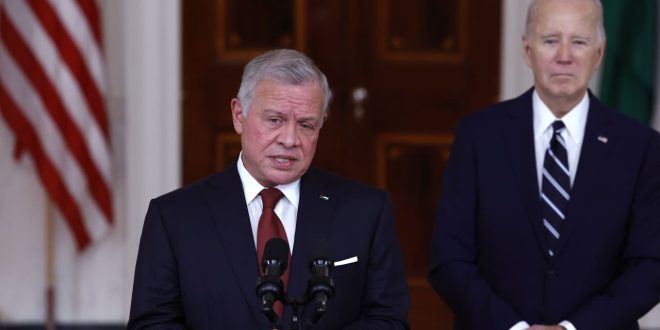 وأضاف الملك عبدالله الثاني، في تصريحات صحفية مشتركة مع الرئيس الأمريكي جو بايدن عقب قمة عقدت في البيت الأبيض، الاثنين، أن “الحرب على قطاع غ-زة التي تعد واحدة من أكثر الحروب تدميرا في التاريخ الحديث لا تزال مستمرة”، مؤكدا أنه “لا يمكننا أن نقف متفرجين وندع هذا الوضع يستمر”، وفقا لبيان نشره الديوان الملكي الأردني.