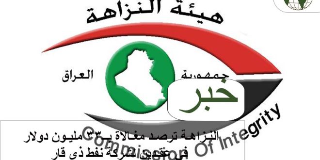 أعلنت هيئة النزاهة الاتحادية، اليوم الاثنين، عن رصد مغـالاة بـ(33) مليـون دولار في عقـدين لشركة نفط ذي قار.