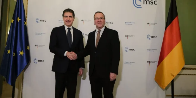 وقال المكتب الإعلامي لرئاسة الإقليم في بيان ، إن “رئيس إقليم كوردستان، نيجيرفان بارزاني، اجتمع مساء اليوم، مع وزير دفاع جمهورية ألمانيا الاتحادية بوريس بيستوريوس، على هامش أعمال مؤتمر ميونخ للأمن”.