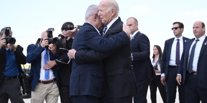 وأبرز رواد مواقع التواصل لحظة العناق بين بايدن ونتنياهو في هذه الرحلة غير العادية والعالية بالمخاطر إلى إسرائيل،