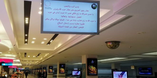 وتقول الرسالة المنشورة على الشاشات في المطار: “بسم الرب والشعب، مطار رفيق الحريري مش مطار حزب الله وإيران، يا حسن نصر الله ما راح تلاقي نصير إذا بليت لبنان في حرب تتحمل مسؤوليتها وتبعاتها”.